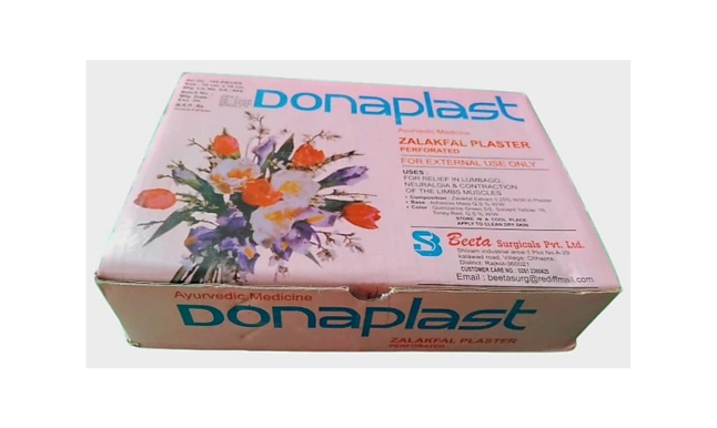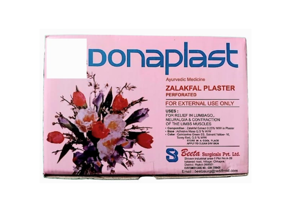 Donaplast Zalakfal Perforated Plaster is a medicated pain-relief patch commonly used in Ayurvedic and traditional medicine. It is primarily used to provide targeted heat therapy (thermotherapy) for muscular and joint discomfort.