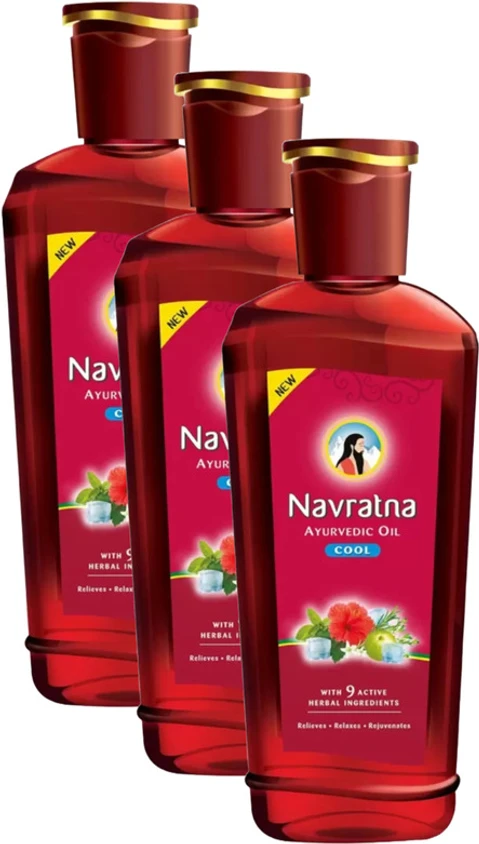 Navratna Ayurvedic Oil is a popular brand of cooling hair oil. The oil is typically red in color and is formulated with a blend of Ayurvedic herbs and essential oils. The name “Navratna” translates to “nine jewels” in Sanskrit, referring to the nine unique ingredients traditionally used in its preparation.