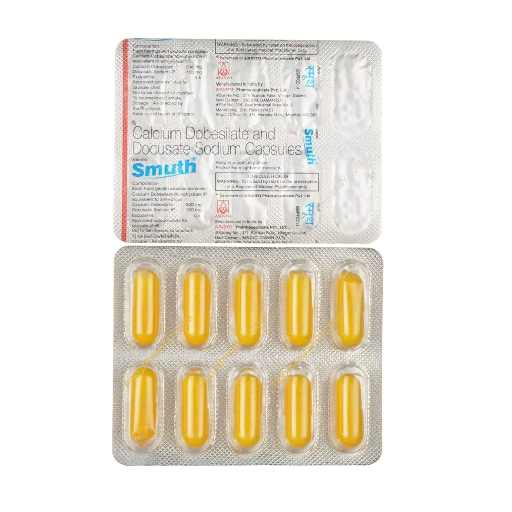 SMUTH CAPSULE helps to relieve constipation, where docusate aids in the retention of water and fat in the feces, making them soft, slick and simpler to pass. Calcium dobesilate works on the walls of the small blood vessels to lessen leakage and permeability. Additionally, it enhances blood flow by lessening blood viscosity, reducing inflammation in piles and haemorrhoids and fostering recovery.