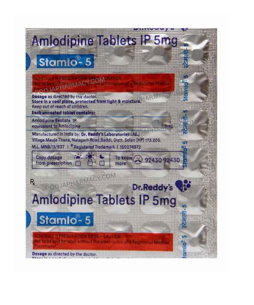 Stamlo 5 tablets are used to treat high blood pressure and angina pectoris, which is chest pain caused by reduced blood flow to the heart. The active ingredient in this medication is amlodipine. Stamlo 5 works by relaxing blood vessels and improving blood circulation, ultimately reducing the risk of heart attacks and strokes.