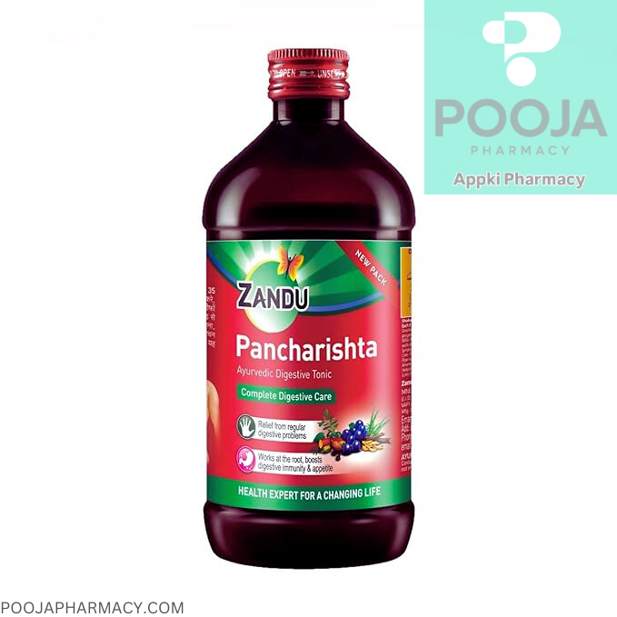 Zandu Pancharishta is a popular Ayurvedic tonic used for digestive health. It is a combination of various herbs and is available in syrup form.